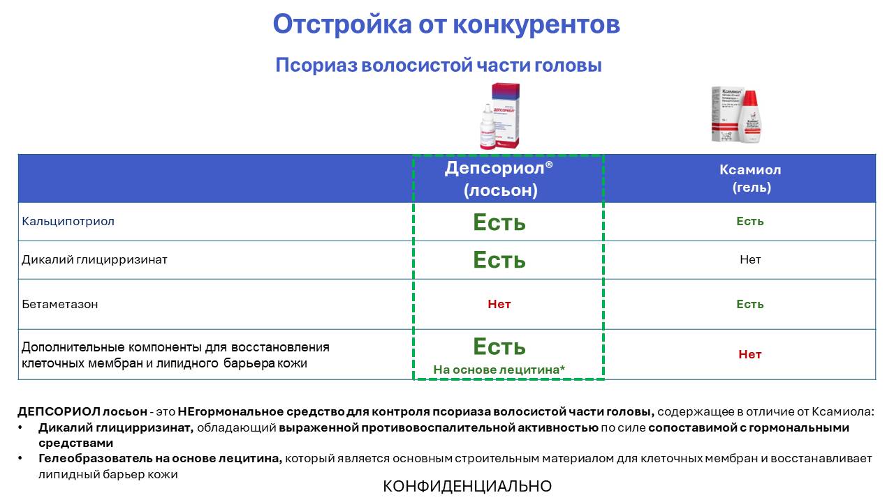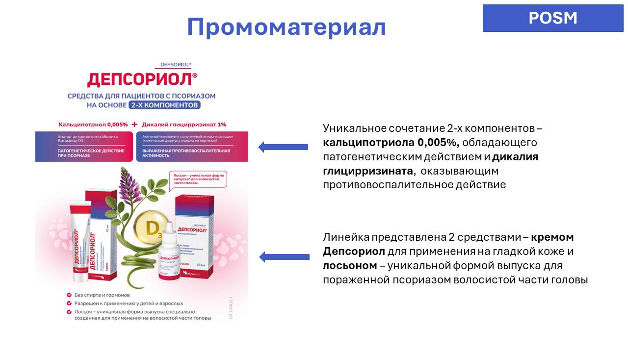 Ключевое сообщение: ДЕПСОРИОЛ® - негормональное средство с выраженной противовоспалительной активностью для контроля псориаза волосистой