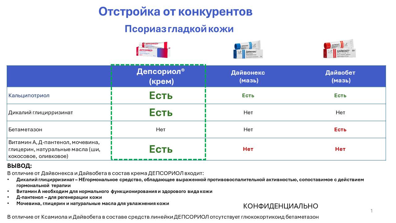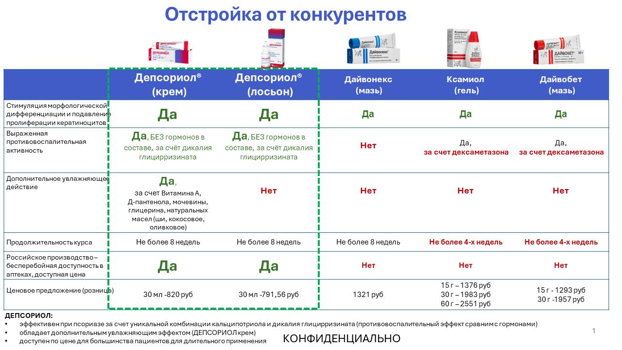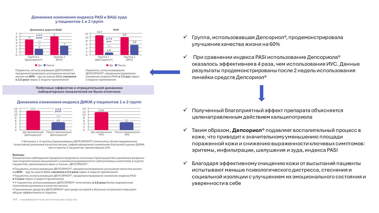 | Депсориол® — эффективное средство для ухода за кожей с кальципотриолом, предназначенное для длительного применения при хроническом течении псориаза | Благодаря выраженному уходовому действию Депсориол® снижает потребность в более дорогостоящих терапевтических вмешательствах (например, в системной терапии, инъекционных препаратах или частых визитах к врачу) | Экономия на лечении за счёт уменьшения количества обострений и необходимости дорогостоящих медицинских процедур, снижение затрат на дополнительные препараты для устранения осложнений |
