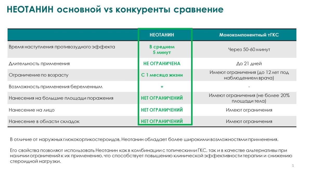 1.НЕОТАНИН обладает комплексным действием против зуда и воспаления на коже при обострении дерматозов (атопический дерматит, экзема) на всех стадиях воспалительного процесса