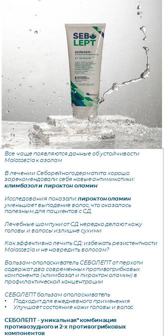 6.Договориться о назначении Себолепт шампуня от перхоти + Себолепт бальзама-ополаскивателя пациентам с обострением СД вместо шампуней с кетоконазолом (не менее, чем 3-м пациентам в неделю).
