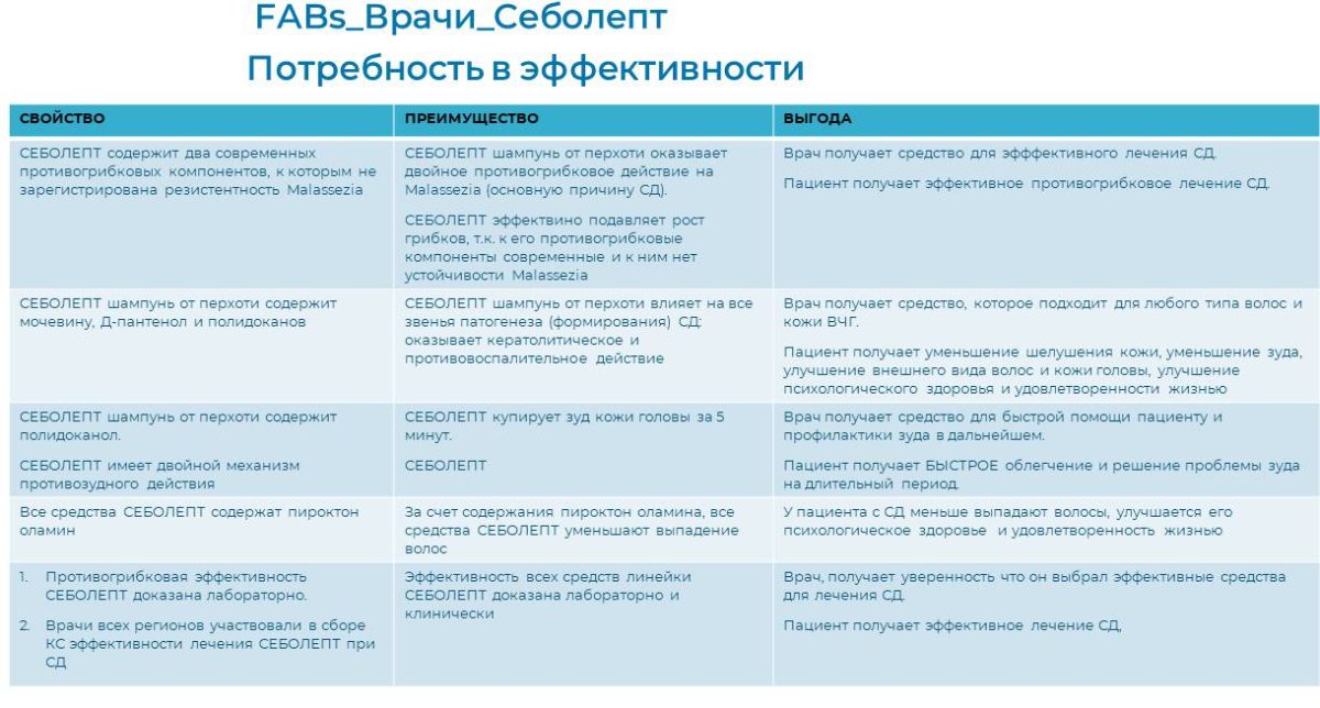 - Ключевое сообщение: Себолепт — уникальная* комбинация противозудного и 2-х противогрибковых компонентов против перхоти и зуда кожи головы.