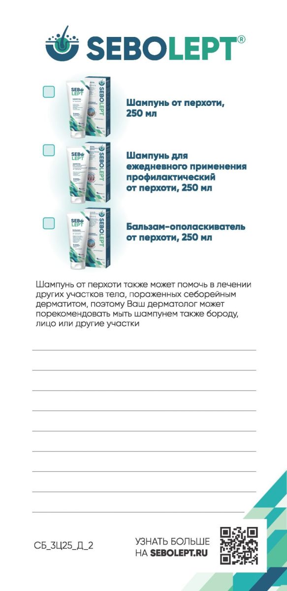 4.Напомнить врачу, что Себолепт линейка включает средства для лечения и профилактики перхоти и зуда: шампунь от перхоти — для лечения, шампунь ежедневный и бальзам ополаскиватель для профилактики перхоти и зуда.