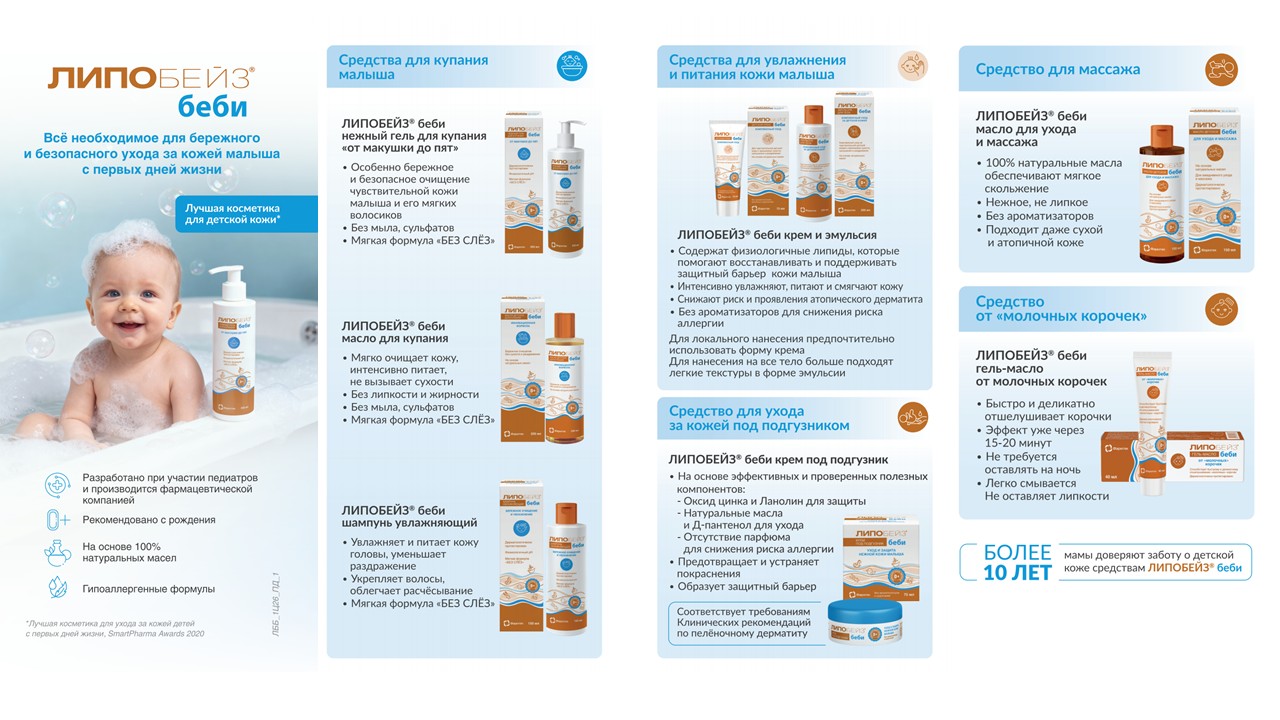 ЛИПОБЕЙЗ беби – линия специализированных эмолентов для комплексного ухода за чувствительной детской кожей с рождения: мягкое очищение, физиологичное увлажнение и надёжная защита