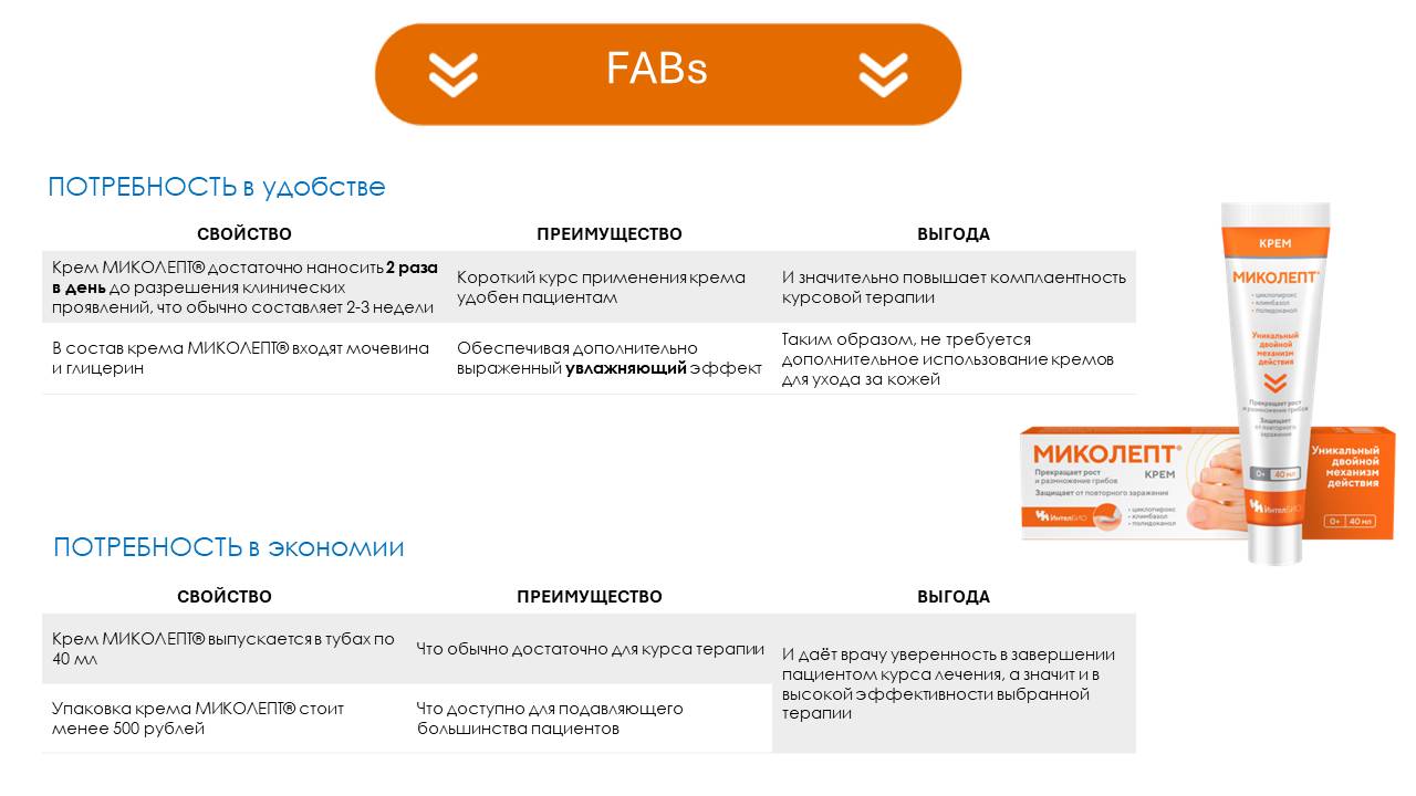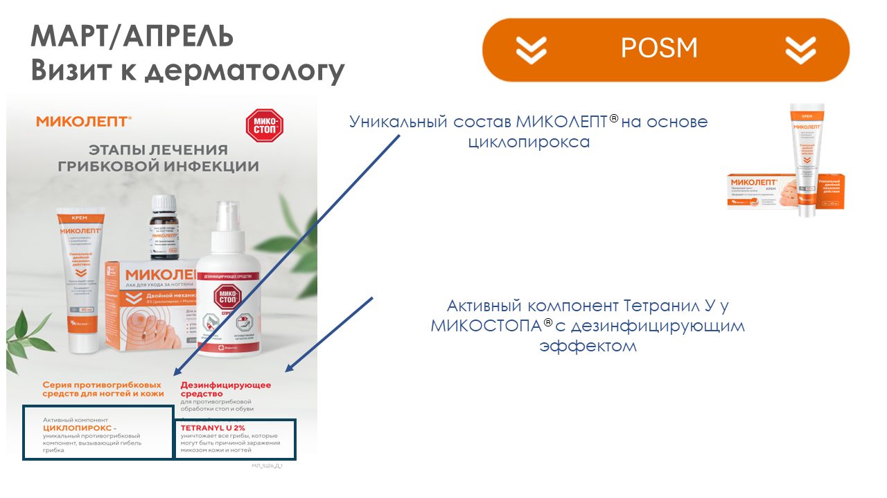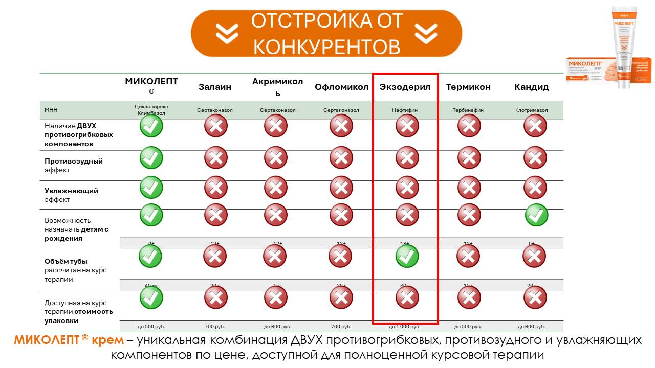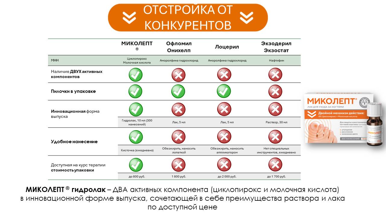 Ключевое сообщение: МИКОЛЕПТ ® крем — крем с 2-мя противогрибковыми компонентами, в составе которого циклопирокс, к которому отсутствует резистентность, а также содержит противозудный и увлажняющий компоненты.