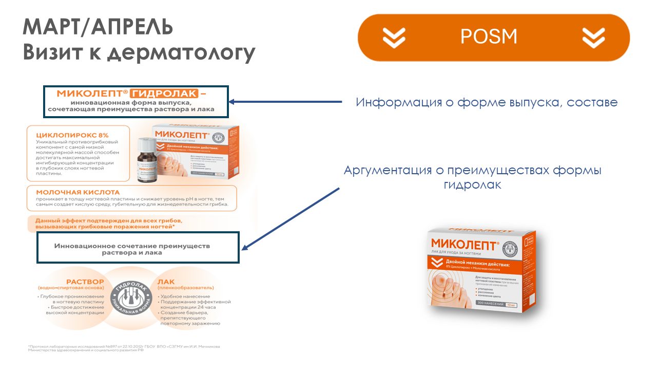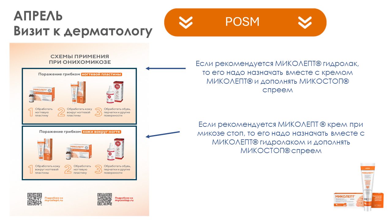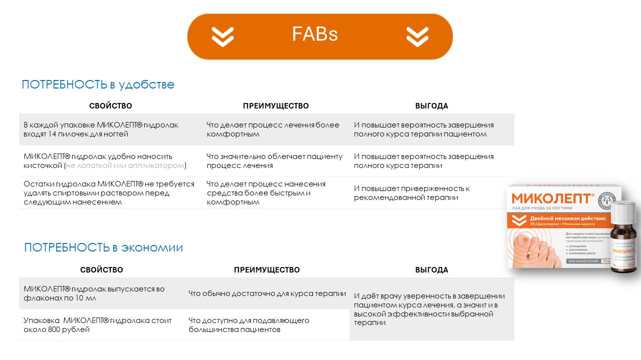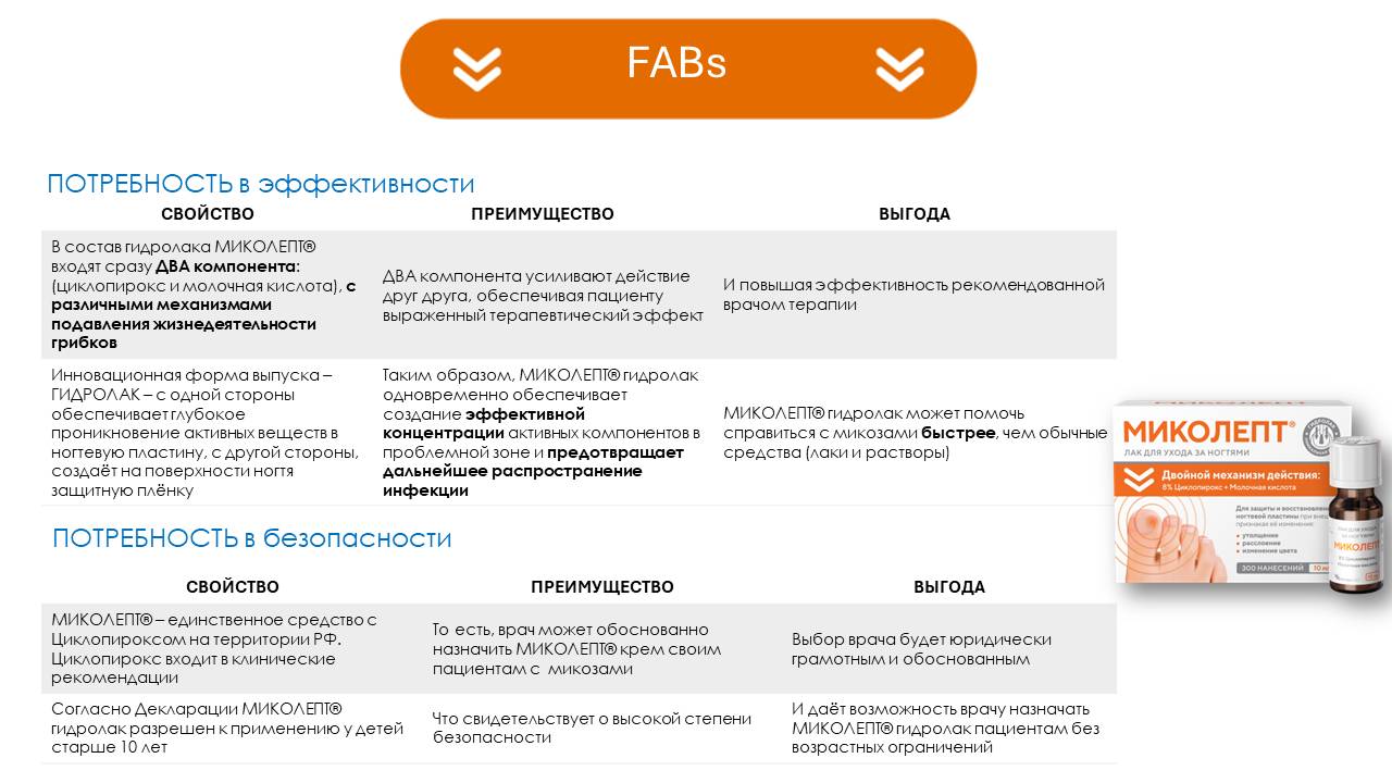 Ключевое сообщение: МИКОЛЕПТ ® крем — крем с 2-мя противогрибковыми компонентами, в составе которого циклопирокс, к которому отсутствует резистентность, а также содержит противозудный и увлажняющий компоненты.