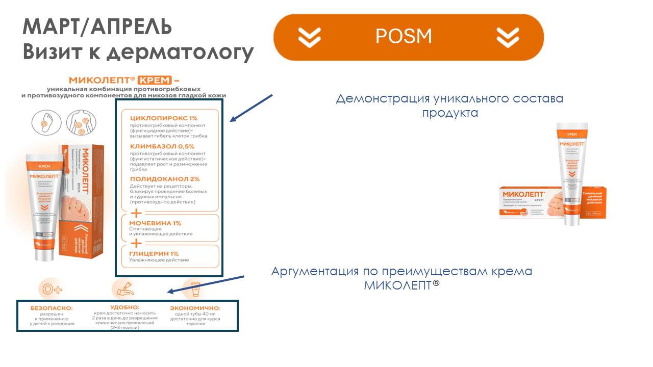 3. Сформировать у врача знание о том, что: МИКОЛЕПТ® крем – это уникальная комбинация 2-х противогрибковых и противозудного компонентов, а также имеет в своем составе увлажняющие компоненты