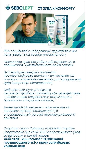 - Решение: Назначить для эффективного лечения Себорейного дерматита и купирования ЗУДА средства Себолепт с двумя современными противогрибковыми компонентами и двойным механизмом противозудного действия.