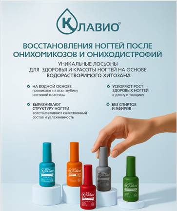 КЛАВИО — это уникальные лосьоны для восстановления ногтей после онихомикозов и при ониходистрофиях с формулой на основе водорастворимого хитозана и витаминно-минерального комплекса.