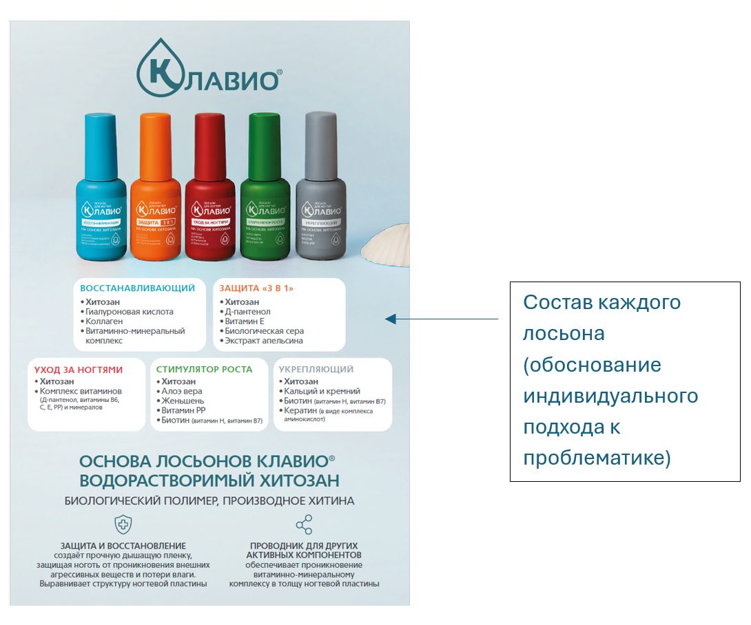 3.Инициировать назначение лосьонов КЛАВИО пациентам с ониходистрофиями и/или онихомикозами для восстановления ногтей (договориться с врачом о получении опыта не менее, чем у 5-ти пациентов)